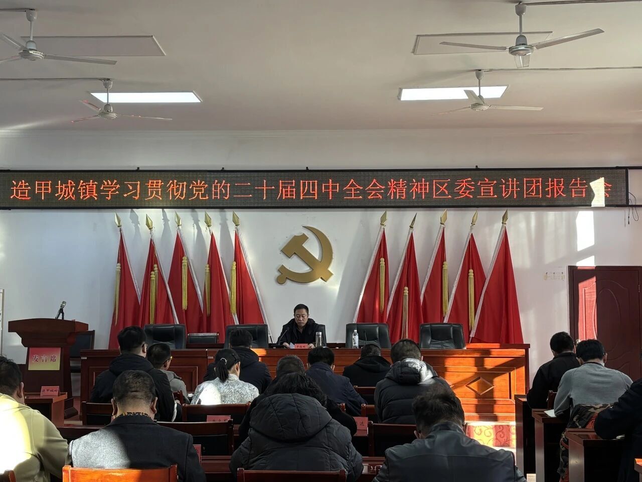 为全面深入学习领会党的二十届四中全会精神,认真落实中央精神和市委、区委部署要求,近日,造甲城镇举办学习贯彻党的二十届四中全会精神区委宣讲团宣讲报告会,区委宣讲团成员、造甲城镇党委书记于福利主持会议并作宣讲报告。镇领导班子成员,各村、社区书记,各科室负责人以及企业代表参加会议。