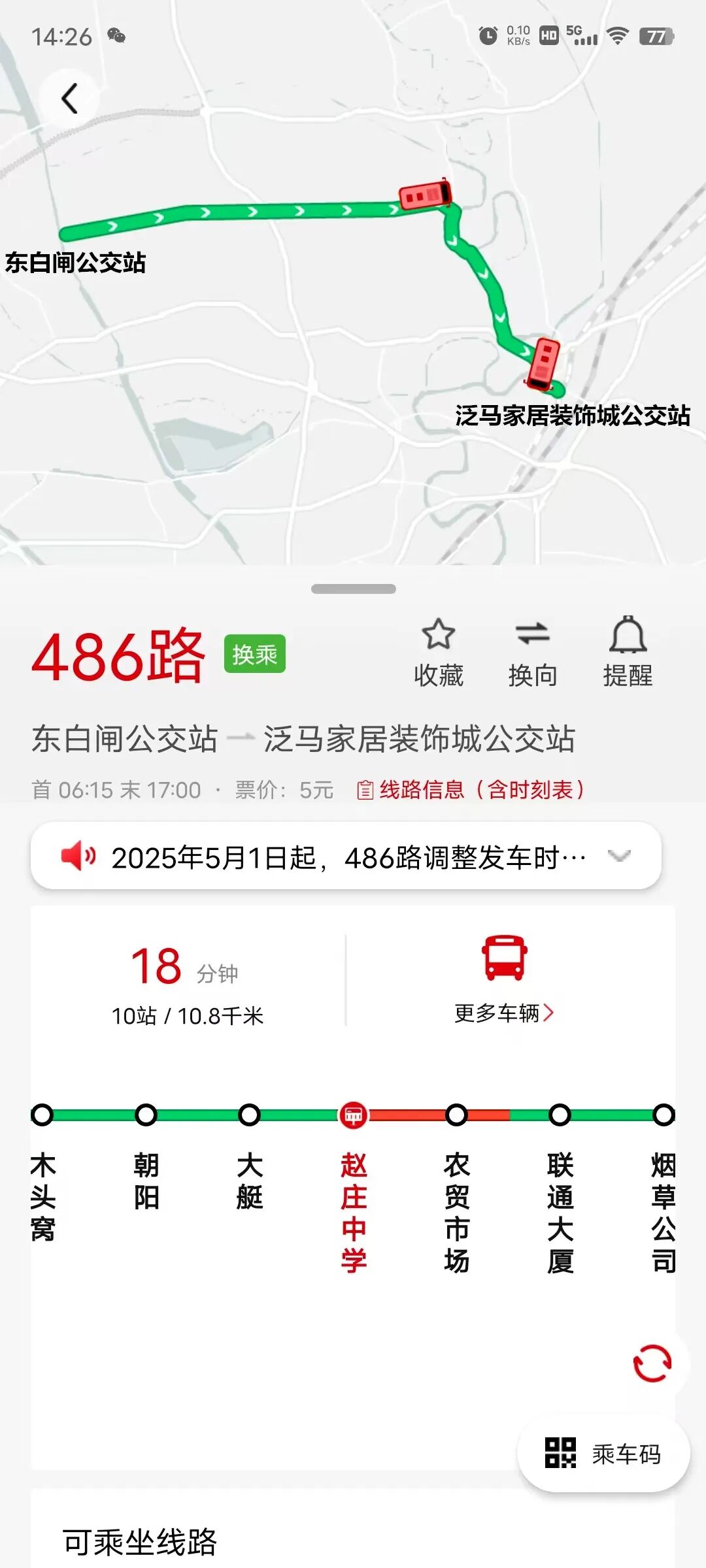由东白闸公交站发往泛马家居装饰城公交站,线路长度42公里,单程运营时间70分钟,定点发车,一票制票价5元。调整后,东白闸公交站发车时间:6:15、8:00、8:40、9:20、10:30、11:30、12:00、13:40、14:40、16:30、17:00;泛马家居装饰城公交站发车时间:6:20、7:20、8:00、9:20、9:55、10:40、12:30、13:30、14:40、15:30、16:30、17:15、17:45。