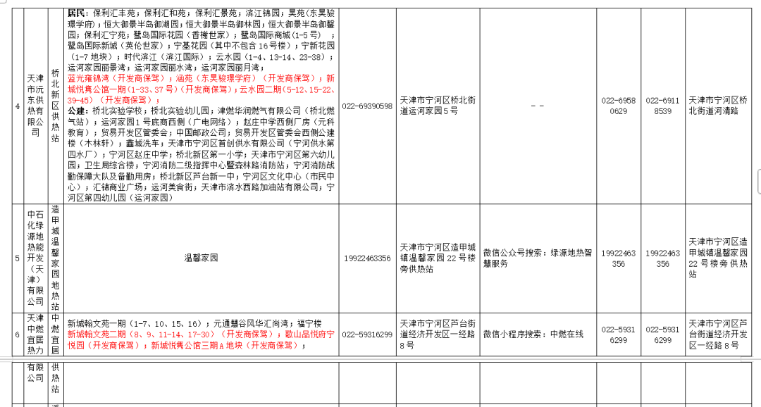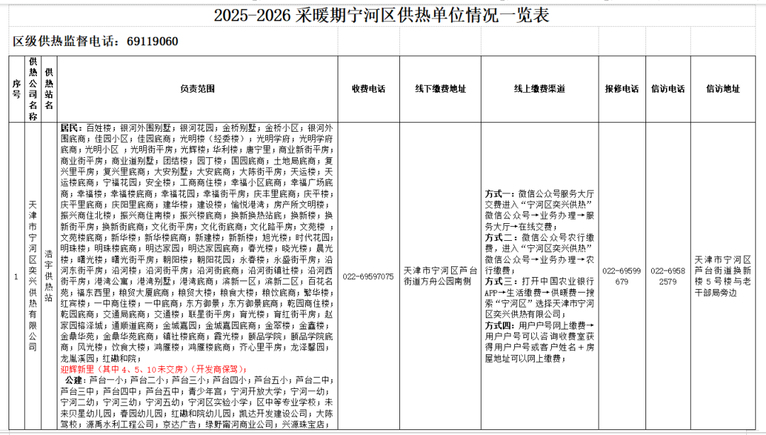 2025-2026年采暖期已经临近,为方便广大居民咨询供热问题和及时报修,现将宁河区2025-2026年采暖期供热单位情况一览表进行公布。目前我区各供热站均已开通24小时服务热线,维修人员全天待命,如遇到供热方面的问题居民可以直接拨打各供热站电话报修以缩短等待时间,减少维修等待期,如反馈的供热问题未能及时处理或对处理结果不满意,市民可拨打区级供热监督电话69119060。