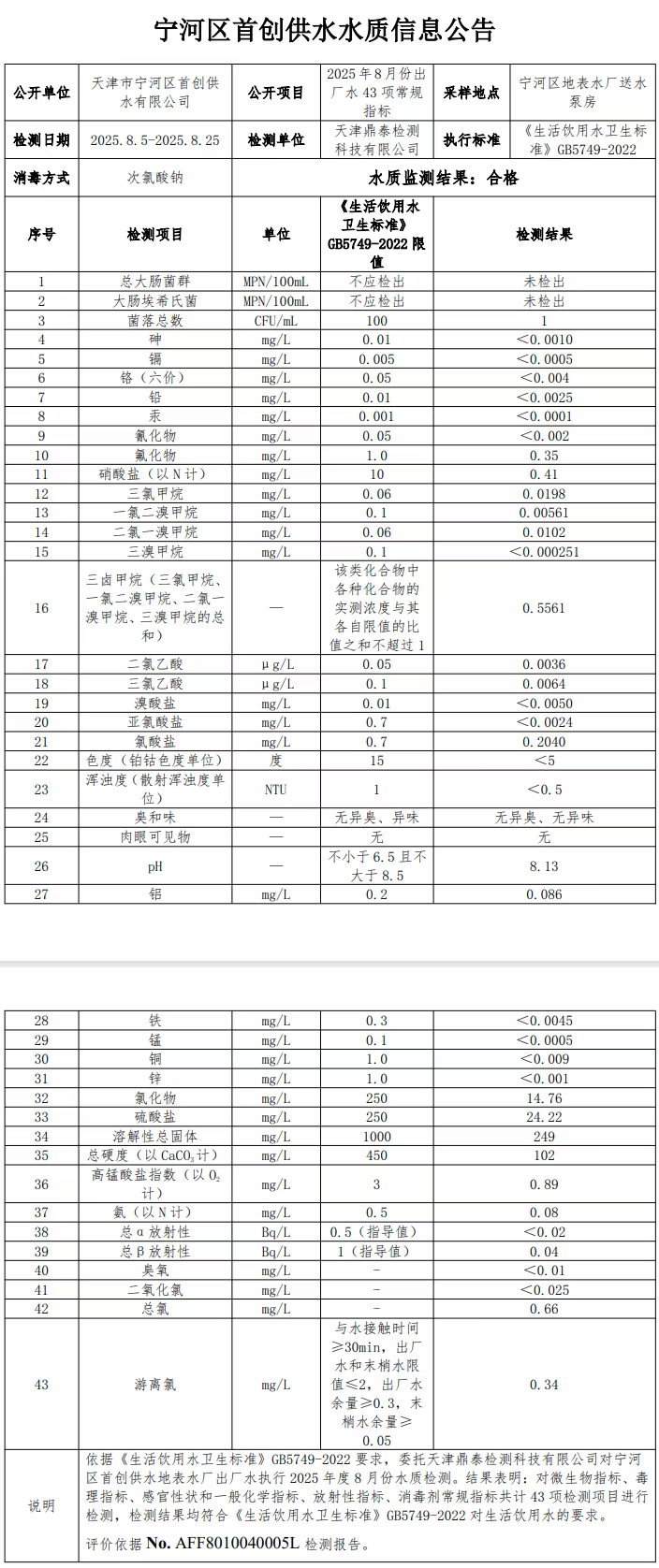 天津市宁河区首创供水有限公司2025年8月43项常规指标水质月检结果