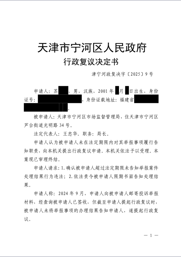 津宁河政复决字〔2025〕9 号天津市宁河区人民政府行政复议决定书