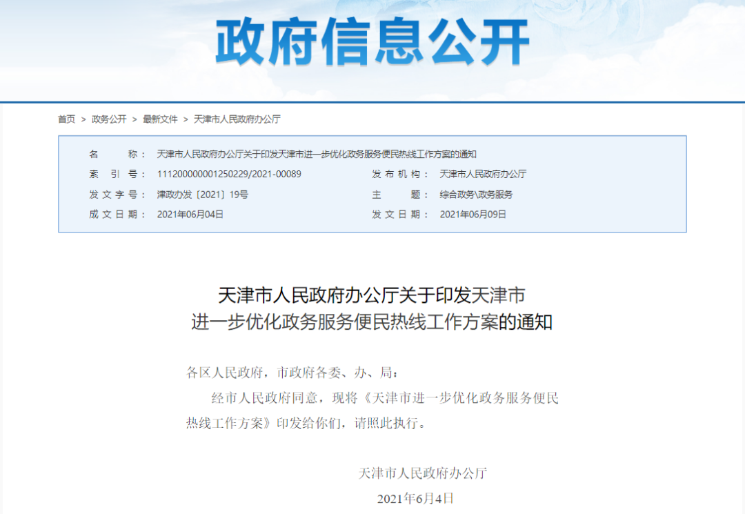 工作方案提出,加快推进除110、119、120、122等紧急热线外的政务服务便民热线归并工作,2021年底前,国务院有关部委设立并在本市接听的和本市设立的政务服务便民热线实现一个号码服务企业和群众的目标。